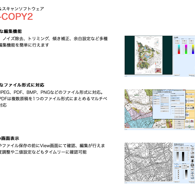直感的な操作で使用できるユーザーインターフェイス。スキャニング業務に求められる枠消し、ノイズ除去、トリミング、傾き補正、余白設定など様々なデジタル編集機能を搭載、多種多様なニーズに幅広くお応えできるコピー&スキャンソフトウェアです。