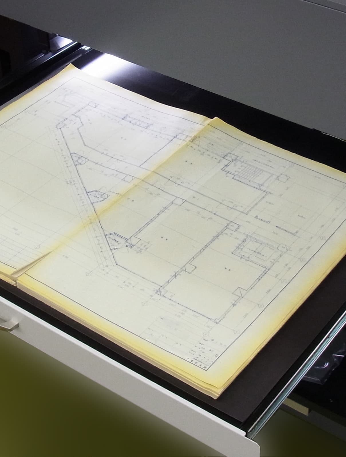 マンション図面、竣工図、施工図、電気配線図など、青焼き図面からのコピーなども、図面専用コート紙や第二原図、ポスター用にフォト光沢紙等などの用紙をご用意しております。